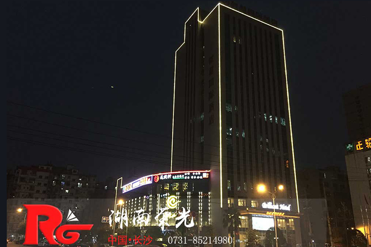 長沙酒店亮化 戶外亮化設(shè)計 LED夜景亮化安裝及施工工程采用IP 65防護等級的LED線條燈,十字星光燈搭配設(shè)計。燈具色溫采用冷、暖色搭配設(shè)計,主線條燈勾勒出建筑亮化的輪廓,采用暖色星光燈營造長沙酒店亮化的溫馨氛圍。